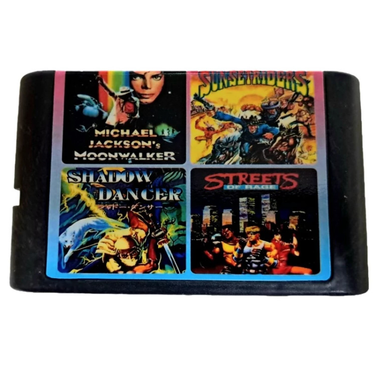 کارتریج 4 لبه سگا شادو دنسر(یک نفره،اکشن نینجا) دوکلانتر یا غروب سرخ(یک نفره،دونفره،اکشن وسترن) شورش در شهر (یک نفره ،دونفره،اکشن ماجراجویی) مایکل جکسن(یک نفره،ماجراجویی فانتزی)