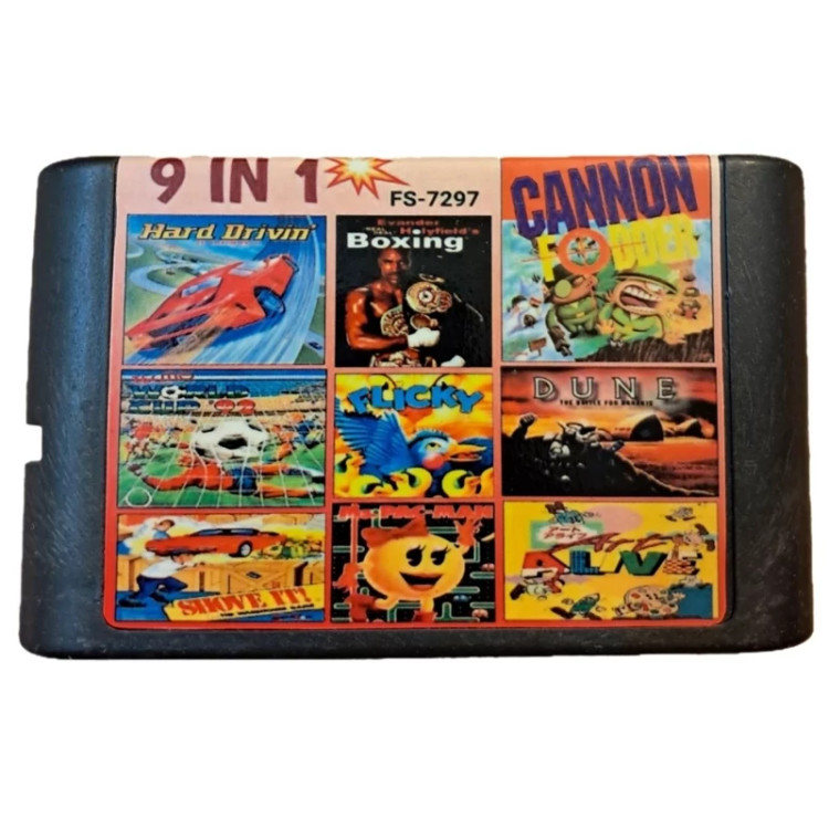 کارتریج 9 لبه سگا کنان فودر (یک نفره،اکشن استراتژی) دوون( یک نفره،جنگی استراتژی) بوکس(دونفره،مبارزه ای) هارد درایوین( یک نفره،ماشینی) فوتبال(دونفره،ورزشی) میس پک من(یک نفره،فانتزی) آرت الایو(یک نفره،نقاشی) جعبه چین(یک نفره،فکری) فیلیکی( یک نفره،فانتزی)